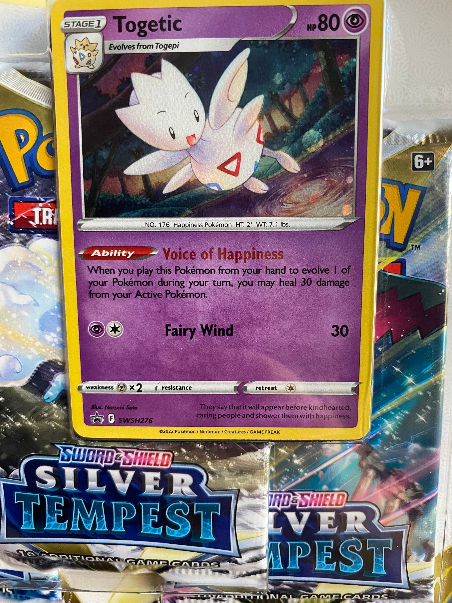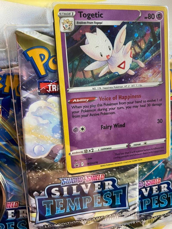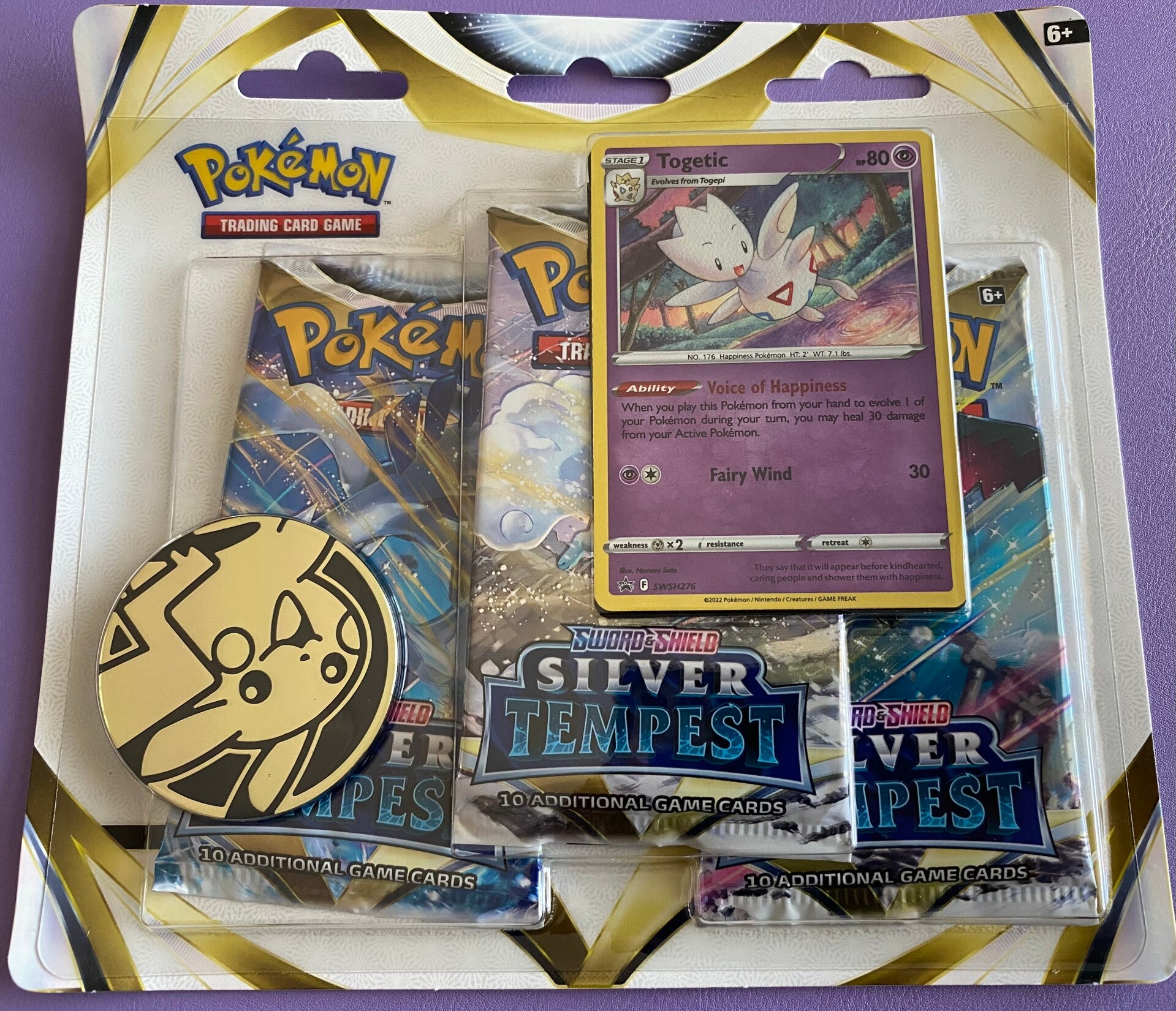 Togetic zit als Foil promokaart bij deze 3 pack Booster, met natuurlijk 3 Booster Packs en een leuke Pikachu munt!